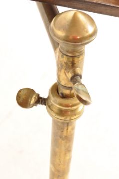 A Victorian 19th century oak and brass reading / book stand lecturn or sheet music stand. The stand having a L shaped mahogany bookshelf raised on a metal column atop a brass quadruped base. Measures 90 x 44 x 45 cm.