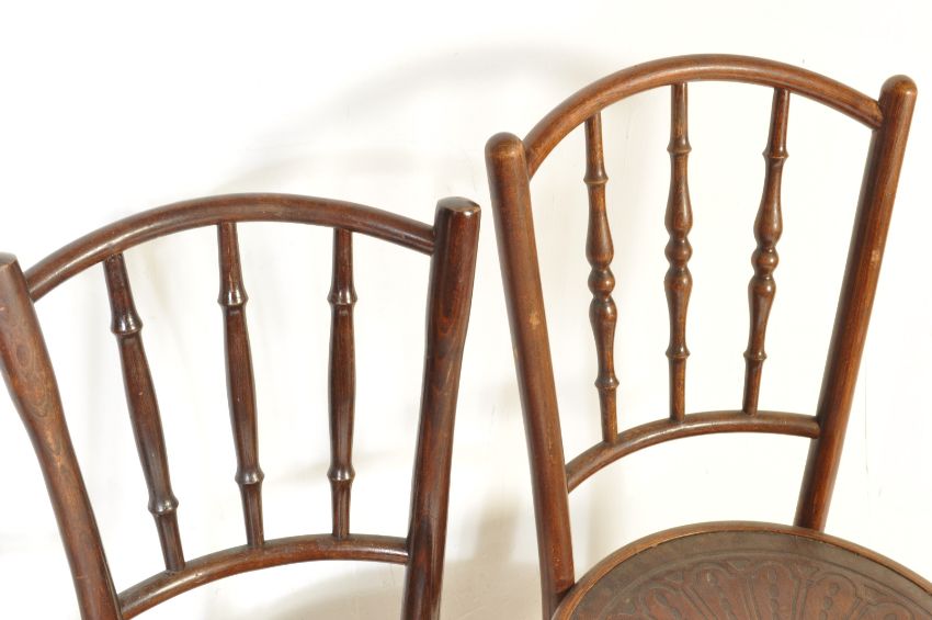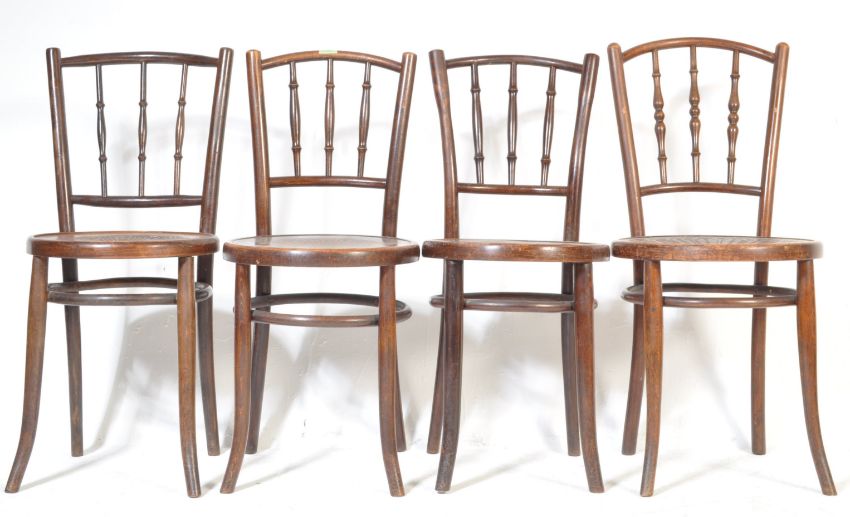 Four vintage retro early 20th century circa 1920’s bentwood chairs café bistro chairs by Fischel Austria. The chairs of a topical form with bentwood backrest, circular seats raised on shaped legs united by a circular stretcher. Makers mark to the underside. Measures: 86cm x 39cm x 39cm.