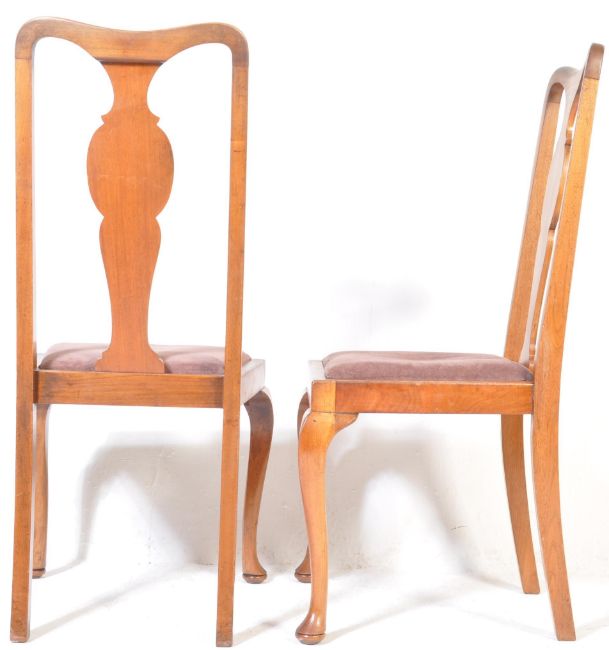 A 20th century, circa 1930's walnut draw leaf dining table together with a set of Queen Anne dining chairs in mahogany with high back splats over drop in seats and cabriole legs. Measures:77cm x 107cm x 84cm.