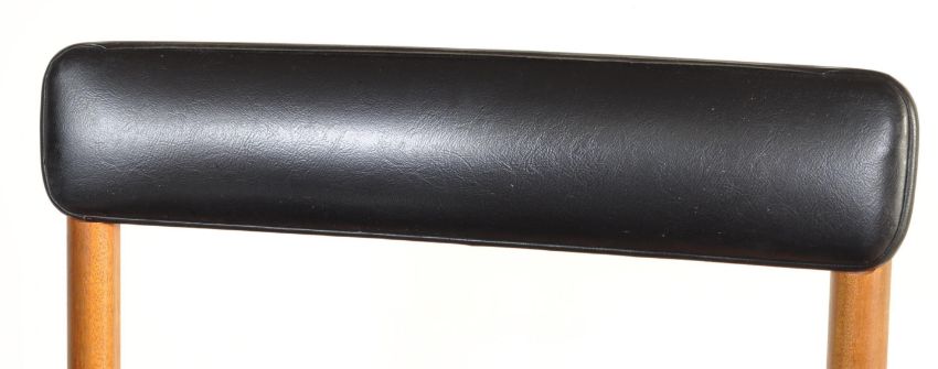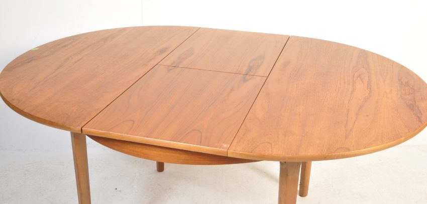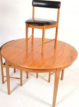 A vintage retro mid 20th century circa 1960’s Mcintosh teak wood dining table and chairs. The extending dining table of a circular form raised on shaped legs to their with a set of three dining chair having black vinyl upholstery, curved backrests, shaped seats raised on turned legs united by stretchers. Measures 75cm h x 168cm w x 122cm d