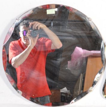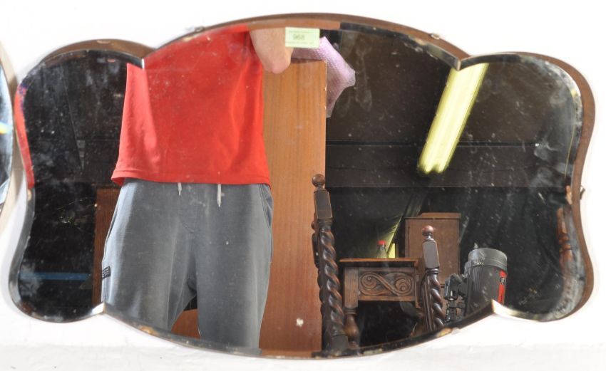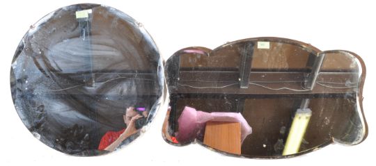 A collection of of two vintage retro mid 20th century frameless wall mirror. One of a circular form with bevelled glass and of a rectangular form with scalloped edges and bevelled glass. Measures 53cm h x 50cm w