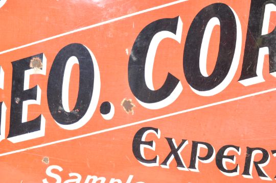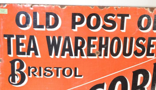 Local Interest - An early 20th century George Corner & Co industrial shop advertising enamel sign. The large orange Bristol enamel sign reading“ Old Post Office tea Warehouse Bristol - Geo. Corner & Cp - Tea Experts & blenders - Samples Free On Application. The sign having black and white 3D writing on a bright orange background. Measures 77cm x 138cm.