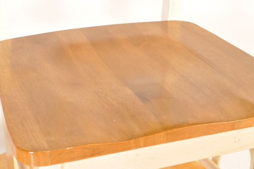 A vintage late 20th century pine table and chairs. The table having chamfered edges with painted apron and legs. Together with four painted dining chairs having painted backrests with panel seats raised on turned paint legs united by stretchers. Measures: 75cm x 150cm x 90cm.