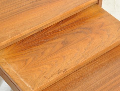 A vintage retro 1970’s danish inspired teak wood nest of tables. The three graduated tables having a rectangular top raised on tapered shaped legs. Measures 45cm h x 53cm w x 37cm d