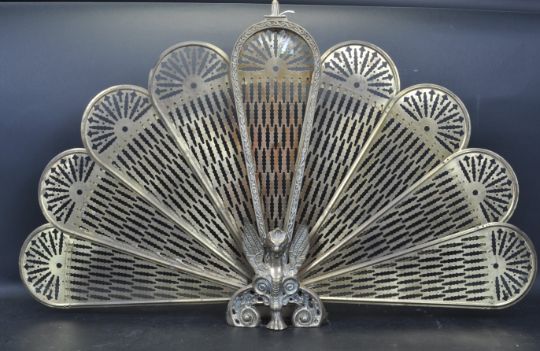 A 20th century Victorian style  " peacock feather " brass metamorphic fire screen, folding in nine segments with pierced decoration raised on plinth base. Measures 57 cm x 87 cm.