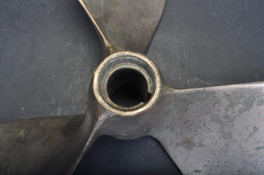 A vintage retro mid 20th century solid bronze boat / ship's propeller having three-bladed design with central hub. Measures 11 cm x 49 cm diameter.