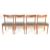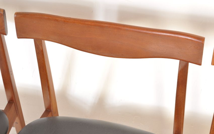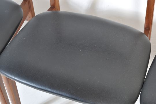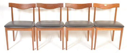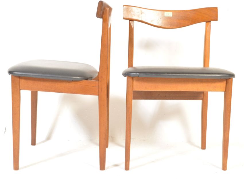 A set of four vintage retro mid 20th century teak wood dining chair in the manner of Mcintosh. The chairs having curved backrests, black vinyl seats raised on tapered supports. Measures 71cm x 50cm x 43cm.