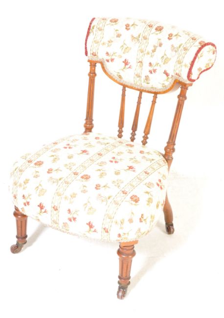 A 19th century Victorian mahogany bedroom / library / hall  chair having a cushion top rail, reeded spindle back with cushioned seat raised on reeded legs atop castors. Stamped 6747 to the inside of the rear leg. Measures 75cm x 53cm x 19cm.