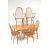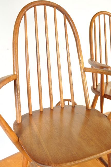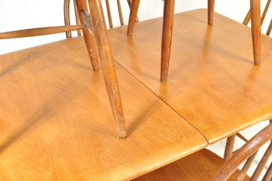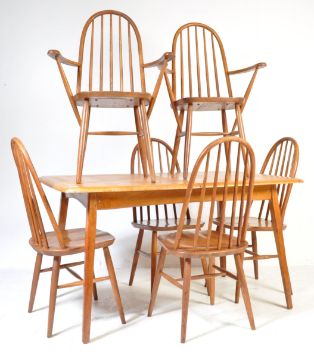 A retro vintage late 20th century Ercol style dining table and chairs. The chairs all having a chamfered edge being raised on angular tapering legs in the Quaker style Windsor chairs of Ercol, Together with matching dining table