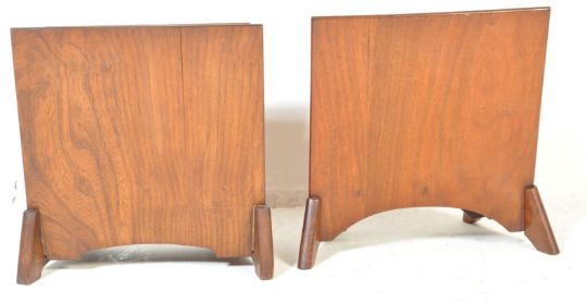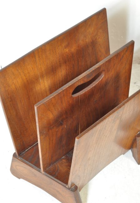 A pair of vintage retro mid 20th century magazine racks. The magazine rack having three graduated dividers with pierced handle to the top raised on four shaped angular supports. Measures 39cm x 38cm x 26cm.