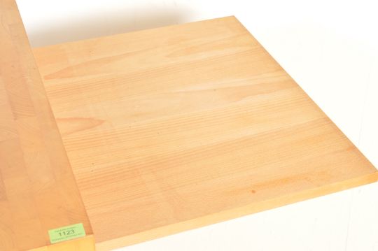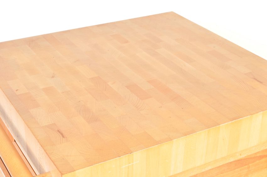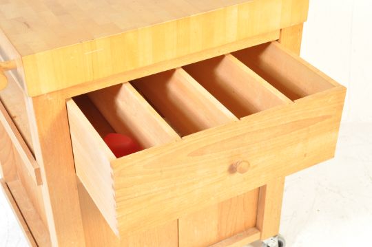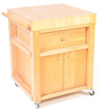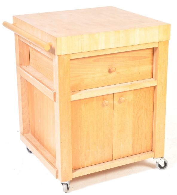 A vintage style wooden kitchen island / butchers block island. The island having a square butchers block top with single drawer to the frieze raised on square legs. Measures 90cm x 76cm x 68cm.