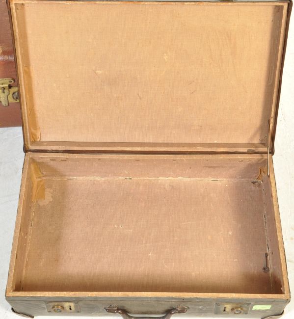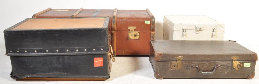 A group of vintage retro mid 20th century shipping trunks / storage boxes. The collection includes a wooden banded trunk with metal locks to the front together with another suitcase and two lidded boxes. Condition: good used condition.