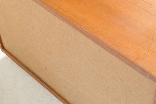 A vintage retro mid 20th century Danish inspired teak wood veneer chest of drawers of a rectangular form with four long graduate drawers raised on a plinth base. Measures: 63cm x 91cm x 53cm.