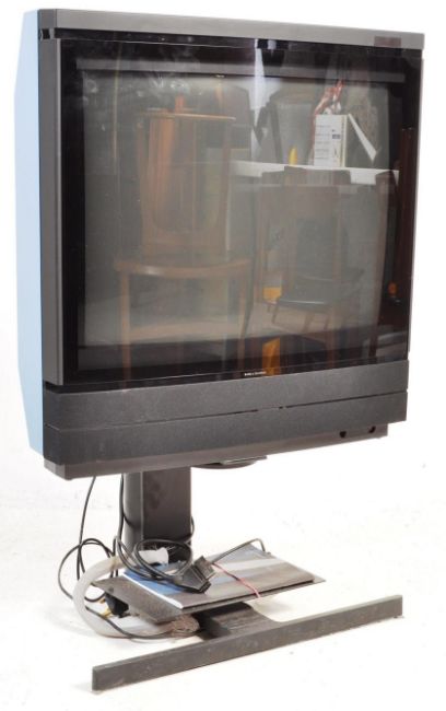 An early 21st century Bang & Olufsen Beovision MX8000 television / TV having a 25" screen with instruction manual and CD ROM raised on a stand. Produced between 2002 - 2005. Measures 97 x 64 x 47 cm.