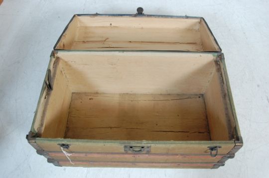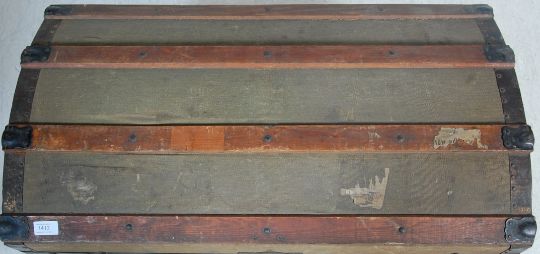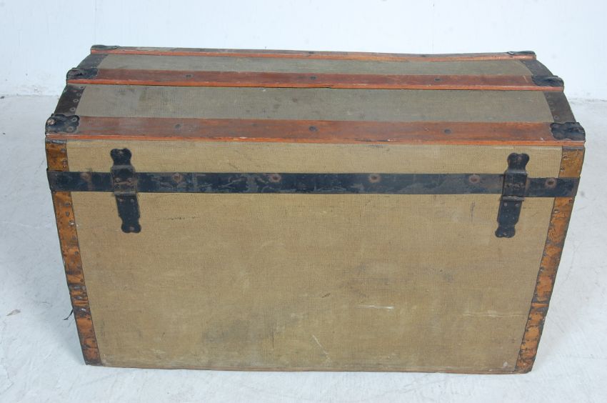 A 1930’s shipping trunk / storage trunk. The trunk having a dome top canvas covered body with wooden slats, metal front lock, side handles and corner bumpers. Measures: 84cm x 135cm x 46cm.