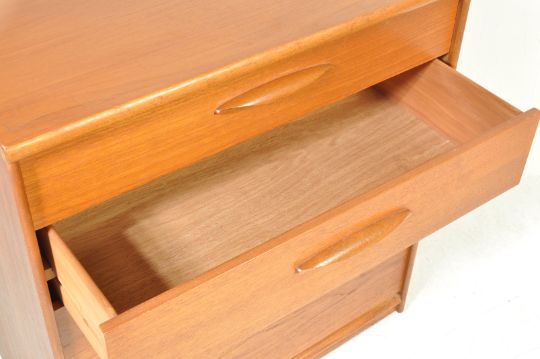 A vintage retro mid 20th century teak wood veneer chest of drawers by Austinsuite. The chest of drawers of a rectangular form having four graduated drawers raised on a plinth base. Measures: 85cm x 79cm x 43cm.