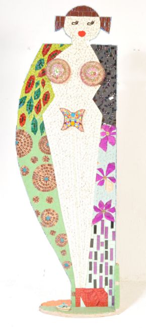 A contemporary double sided tile artwork portraying a stylised male / female in polychrome detailing. Produced by a local Bristol artist. Measures 156cm x 50cm  x 53cm.