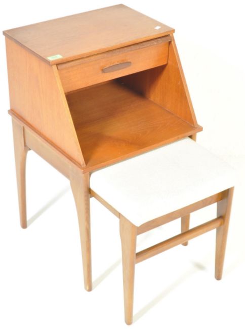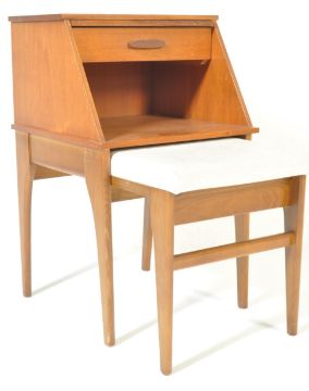 A 1970's retro teak wood Mr Chippy telephone table and chair combination being raised on tapered legs with single drawer and a leatherette cushioned seat stool. Measures: 69cm x43cm x 42cm.