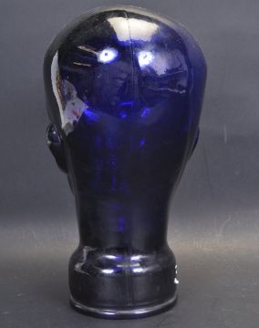 A late 20th century Art Deco style moulded pressed glass phrenology type male head - shop display stand / millinery mannequin head. Moulded and pressed blue glass with moulded male features. Measures 33 cm tall.