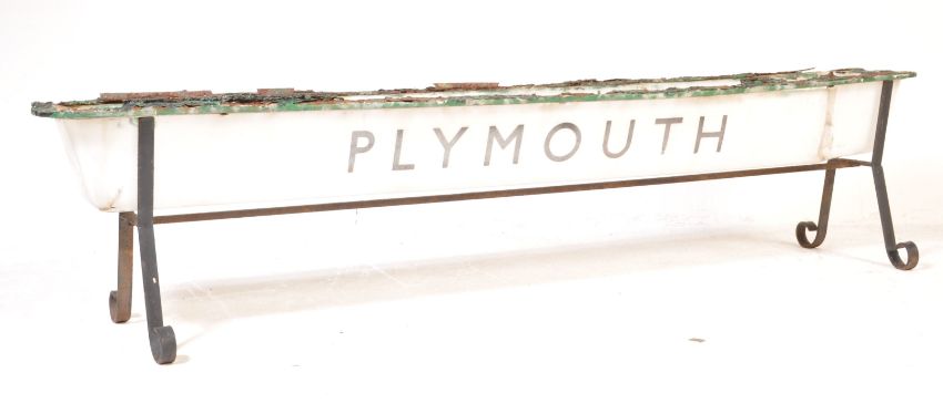 A vintage retro mid 20th century converted old Plymouth shop / sign light box being converted to a plant stand / trough. The plat stand having a long rectangular plexiglass trough raised on arts and crafts metal stand. Measures 41cm x 176cm x 27cm.