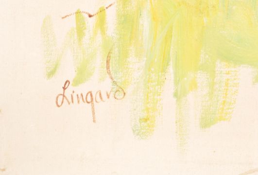 TREVOR LINGARD (born 1952) - A 20th century oil on canvas painting depicting the front of a church with people wooing in. Signed o the lower corner Lingard. No frame. Measures 50cm h x 60cm w