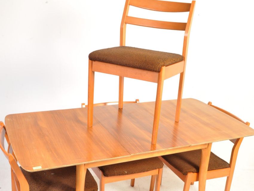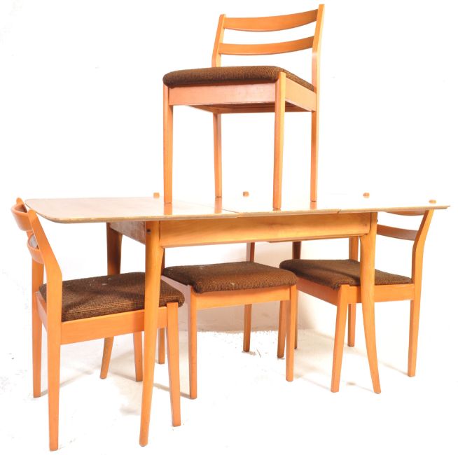 A vintage retro mid 20th century teak wood Schreiber dinning suite. The suite comprising of an extending dining table having two piece top and a spear leaf raised on shaped supports together with a set of four Schreiber dining chair having padded seats raised on shaped legs. Makers label to the underside. Measures 74cm h x 151cm w x 75cm d