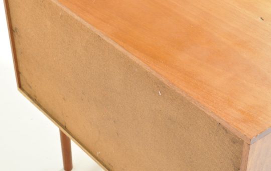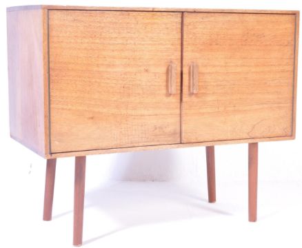 A retro vintage mid 20th century circa 1960's teak record cabinet having twin doors with shaped wooden pulls opening to reveal a shelved interior raised on upright circular supports. Measures: 64cm x 77cm x 38cm.