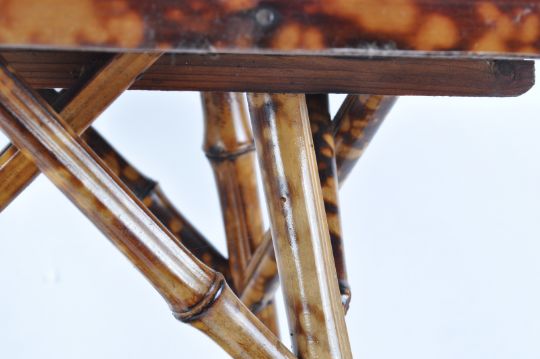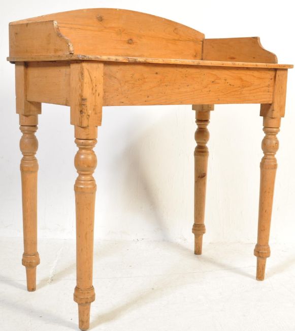 A late 19th century Victorian pine washstand / writing table desk and bamboo side table. The washstand having a arched gallery back, raised on turned supports together with an occasional bamboo table having square top with wicker woven and undertray. Measures 90cm x 80cm x 44cm