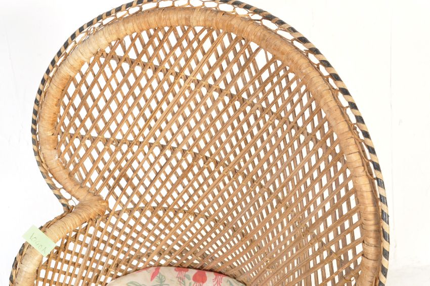 A retro vintage mid 20th century circa 1970s childrens bamboo peacock chair having a hoop back with latticework, cushioned seat pad upholstered in floral fabric raised on a circular base.