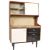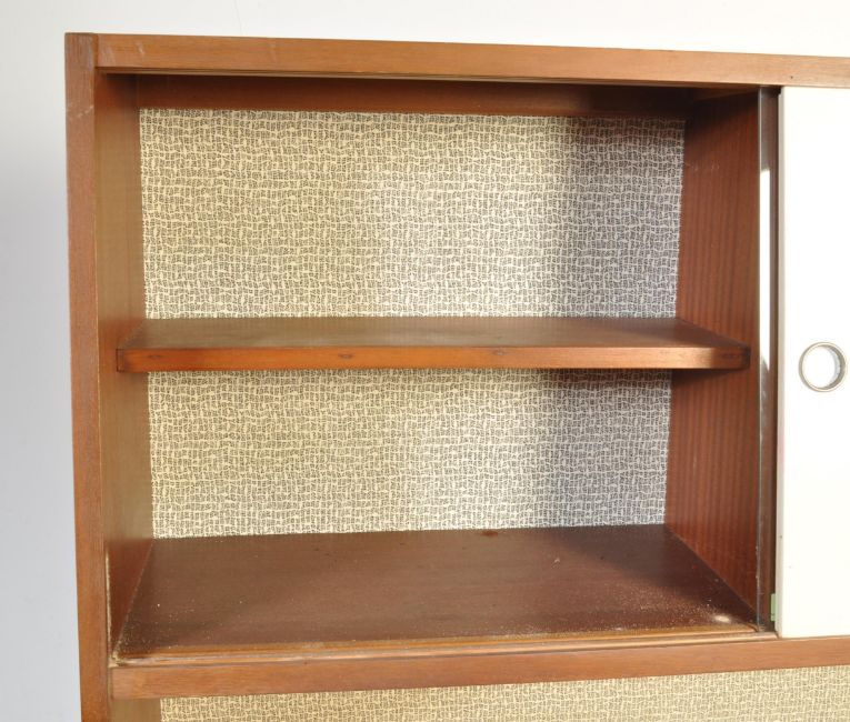 A retro vintage mid 20th century Danish inspired teak wood and melamine room unit  / wall unit by Whiteleaf. The unit having sliding door cupboard atop above a black and white melamine top with a bank of three drawers to the right and single door cupboard to the left raised on black tapered supports. Measures 161cm h x 105cm w x 45cm d