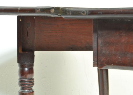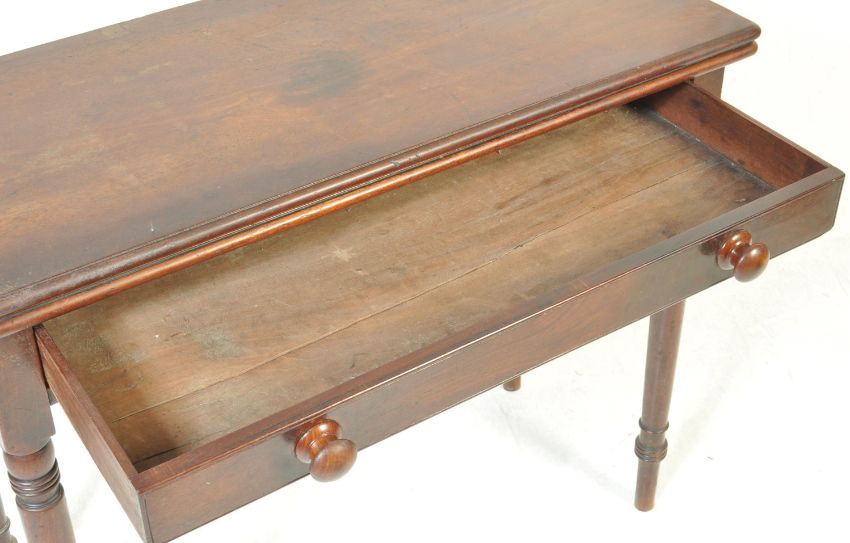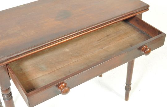 A Victorian 19th century mahogany writing table desk / breakfast table. Raised on turned legs with fitted frieze drawer having a metamorphic hinged flared writing table top above. Measures: 75cm x 92cm x 41cm.