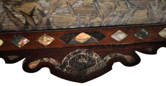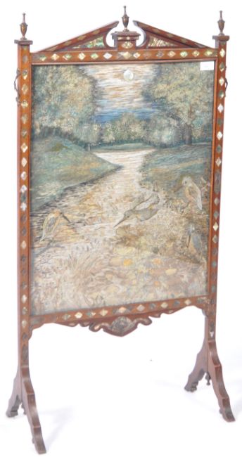 A 19th Century Victorian silk worked fire screen having a mahogany frame with arched pediment top with brass finials and handles to the side and decorative mother of pearl inlay throughout. Charming silk river scene set within with a mother of pearl moon and kingfisher birds to the foreground. All being raised on shaped supports. The screen measures approx; 106cm x 57cm x 27cm.