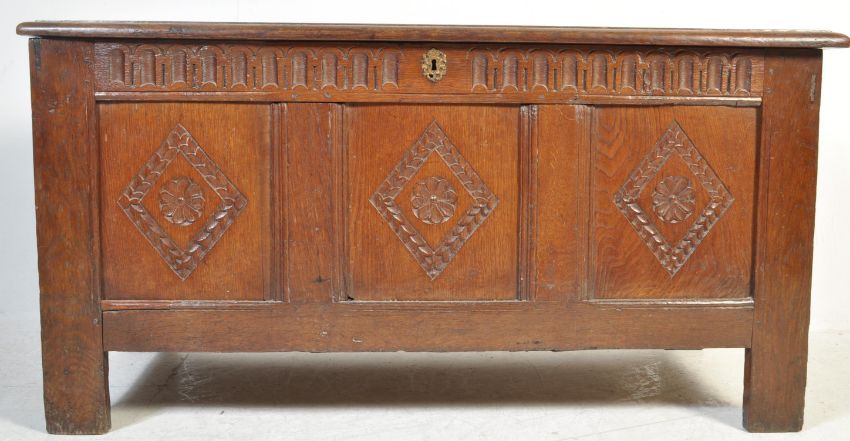 An early 18th century country oak coffer chest. The coffer having a four panelled hinged lid opening to reveal a spacious interior. The coffer has carved lozenge shaped decoration to the front recessed fielded panels, all being raised on stile feet. Measures 38 cm tall.