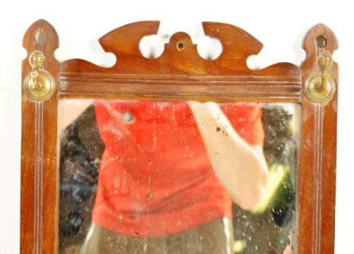 A 19th century Victorian mahogany wall mounted mirror having a pediment top flanked by brass handles, rectangular mirror glass with flip top compartment below. Measures 80cm x 40cm.