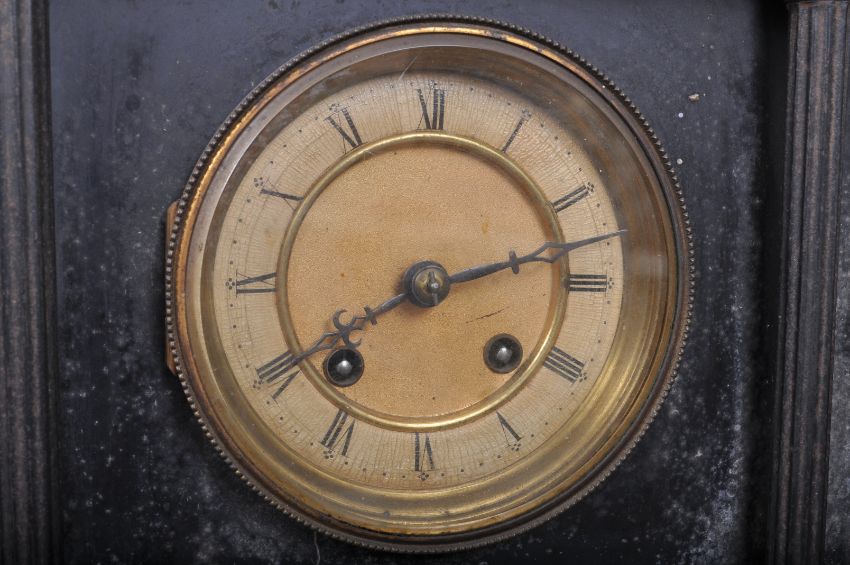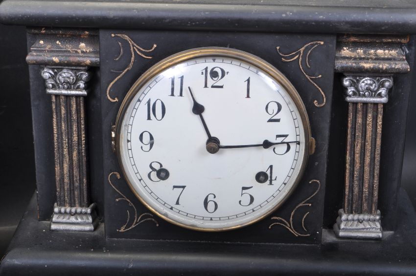 An early 20th century slate 8 day mantel clock of architectural form having a brass and enamel clock face with Roman numerals to the chapter ring raised on a plinth base.  Together with another mantel clock