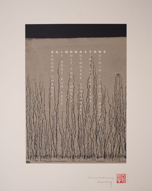 Richard Long (British, b.1945) Rain on a Stone, 2021 Screen printed in six colours, signed in pencil recto from an edition of 60, on wove paper with full margins This is the artist’s own copy, customised for the charities. The artist used River Avon mud and then hung the work. He says: “The artwork is made by nature and gravity.”  Measures 64.5 x 51 cm (25.4 x 20.1 in) Condition: New Condition / Mounted & Framed