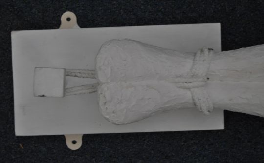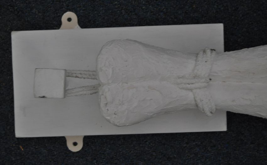 A large and impressive Art Deco influence plaster figurine of a maiden / spirit. The female figurine mounted to a wooden board with feet tied being suspended upside down with arms outstretched and hair hanging down. Painted white finish throughout. Measures approx 174cm long.