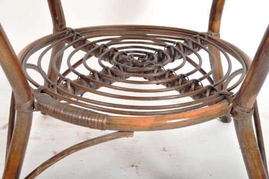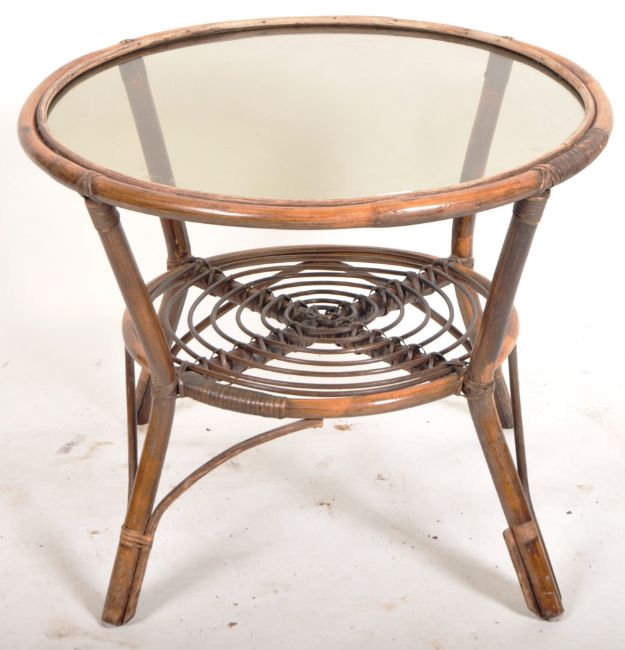 A retro vintage mid 20th Century Italian bamboo coffee table / centre occasional table in the manner of Franco Albini. The table of circular form with inset glass panel and uniting spiral bamboo lower tier uniting the shaped legs. Measures approx; 55cm 69cm.