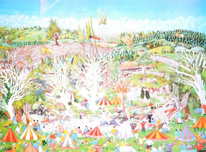 Harry Bilson - Icelandic Artist b1948 - The Last Race - A signed & numbered limited edition giclee print depicting a busy & vibrant scene with horses, figures and trees. To the lower left a depiction of the Grim Reaper chasing. Framed and glazed. Numbered 21/300. Measures approx; 69cm x 84cm.