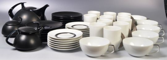 Rosenthal Studio-Linie - Tac Gropius Porcelaine Noire and Cupola White - A contemporary Germany designer tea and coffee service having mix of white and black ceramics with silver highlights throughout. The service comprising of a mat and glossy black finished teapot, sugar bowl and milk jug with teapot having a removable tea strainer within. Selection of coffee cups / cans and tea cups with black and white sources. Each bearing makers marks to the bases. Teapot measures approx; 15cm x 24cm.