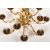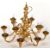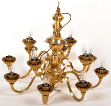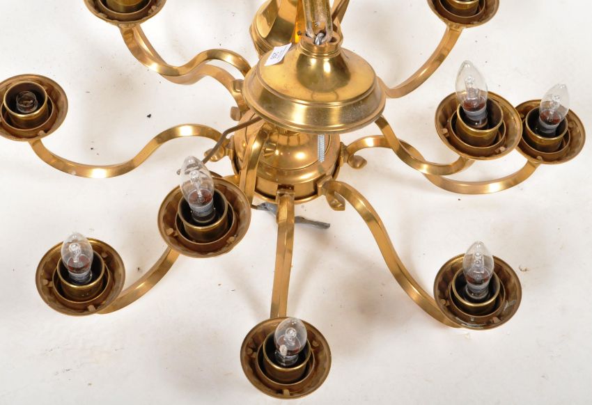 A late 20th Century large twelve arm brass hanging chandelier / electrolier having a central faceted column with two tiers of brass arms. Each arm having shaped glass shades. Minor wear, overall good. Measures approx; 61cm x 75cm diameter.