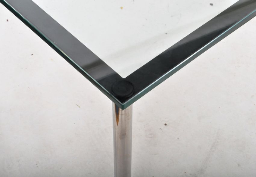Manner of Le Corbusier - LC10 -  A contemporary designer chrome and glass topped dining table having an ebonised steel frame with tubular chrome legs and thick tempered glass top of rectangular form. Measures approx; 75cm x 121cm x 80cm.