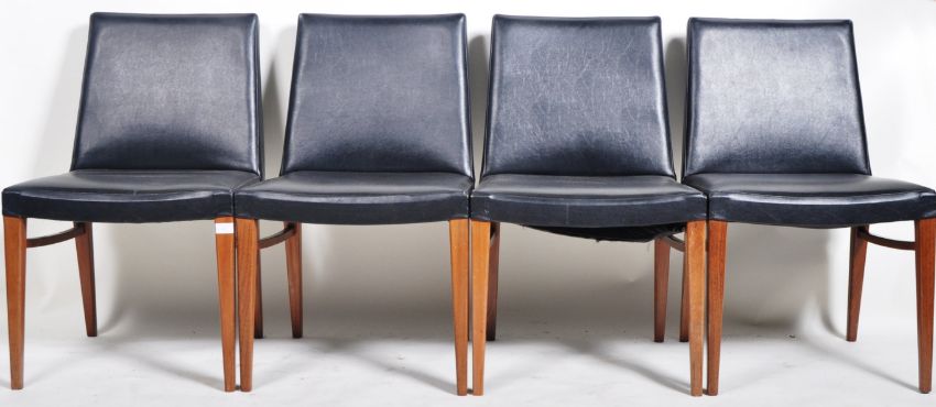 A matching set of eight retro mid Century Danish inspired teak and black leather dining chairs. Each chair having padded back and seat rests with studded black leather. Each being raised on splayed teak supports united by stretchers. Most bearing impressed Reg marks 917050. Wear commensurate with age, overall a good set. Each measures approx; 82cm x 51cm x 48cm.