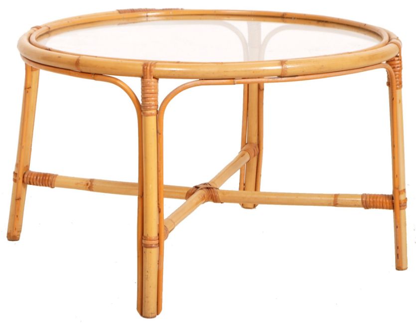 A retro 20th Century bamboo cane / wicker coffee table / occasional table of circular form having an inset glass panel. All being raised on bamboo supports united by an X-framed stretcher. Wear commensurate with age, no visible damage. Measures approx; 39cm x 64cm diameter.