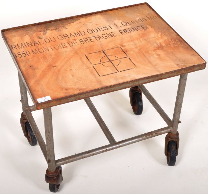 A retro vintage mid 20th Century Industrial workman's single tier trolley / table aid of simple rectangular form having a inset wooden panel top with metal surround. All being raised and supported by tubular legs united by stretchers upin thick rubber castors. Measures approx; 49cm x 57cm x 42cm.