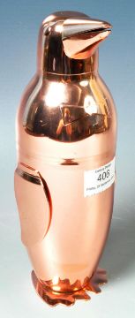 A contemporary copper effect stainless steel cocktail shaker pourer in the form of a penguin wearing a bow tie. Measures approx; 24cm tall.