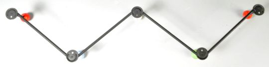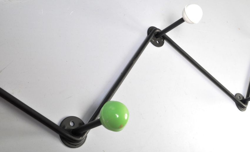 A set of retro 20th Century sputnik atomic coat hooks of 'W' shape form finished in black with multi coloured plastic ball finials. Measures approx; 70cm.