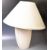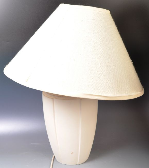 Two late 20th Century Spanish Arte stone table lamp lights of Art Deco influence. One of cylindrical tapering form having a stepped top with the other of oval form with carved squared tapering decoration raised on a square base. Label present to one. Tallest measures approx; 51cm.