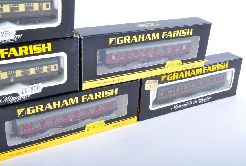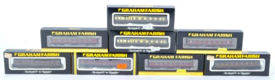 A collection of x8 original boxed Graham Farish N gauge model railway trainset locomotive rolling stock coaches and carriages. Examples to include No. 0626 Mainline Coach LMS, 374-835A Stanier Third Corridor LMS, 0681 British Railways MK1 Corridor, 0636 Break End Coach Mainline LMS and others. All models appearing mint, within original boxes.