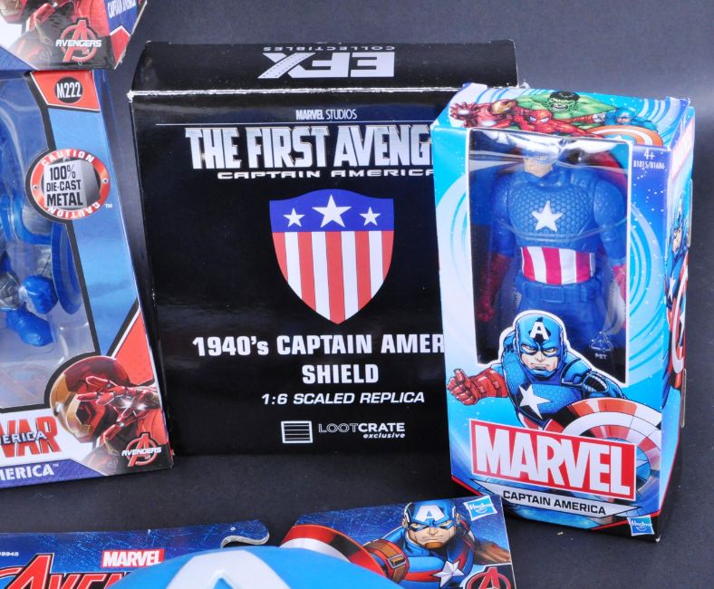 A large collection of assorted Marvel Universe Captain America action figures and accessories. Largely Hasbro made to include; Civil War ' Risk ' board game, Toy Biz Turbo Coupe Vehicle, Superhero Micro Mashers, Metals Diecast figures, Mighty Muggs, Hotwheels and more along with a selection of backpacks and fancy dress masks.